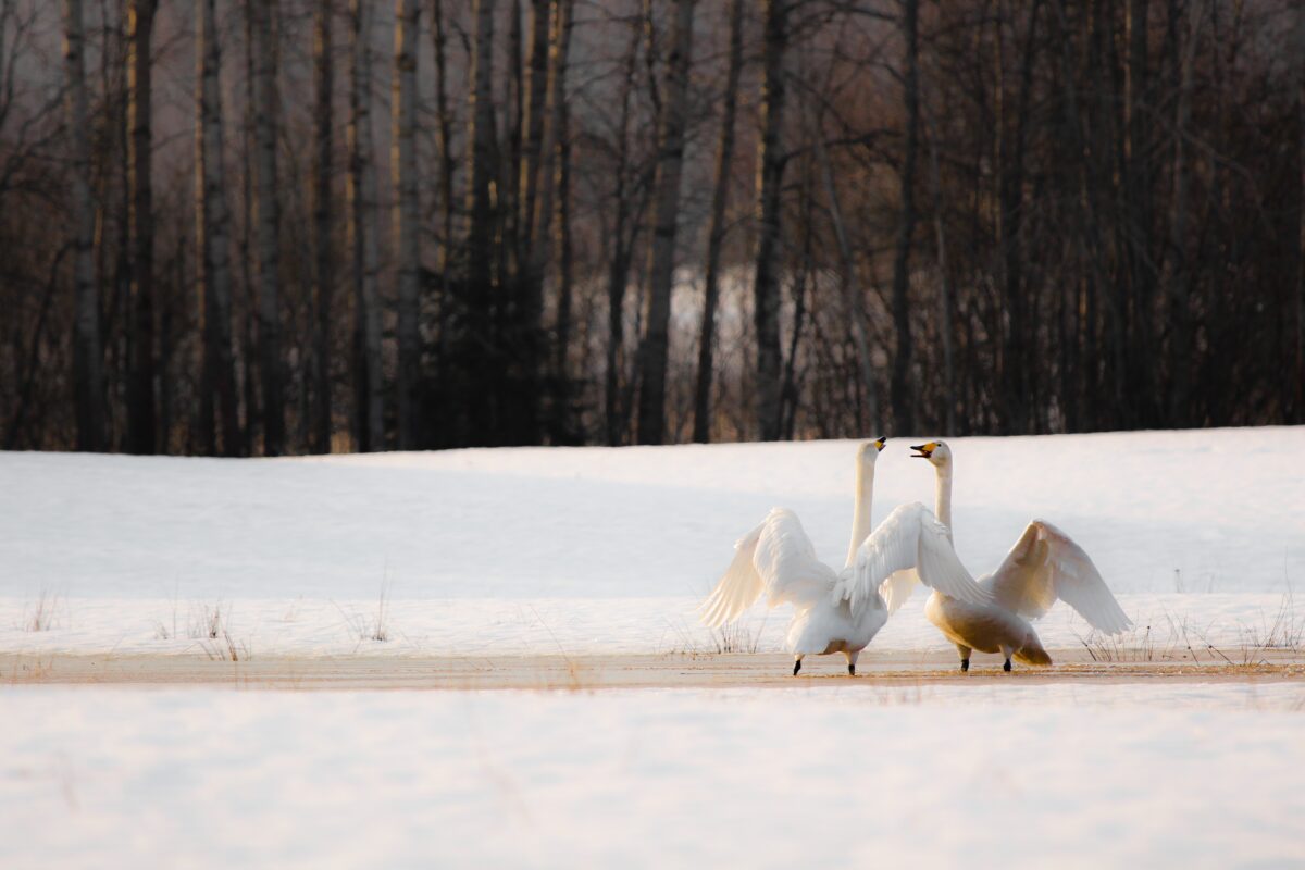Kevättalven aikaan, lumen sulaessa, luonnossa alkaa tapahtua. Laulujoutsen on ensimmäisiä Suomeen palaavia muuttolintuja eikä niiden kantavaa huutelua voi olla kuulematta. Tässä kuvassa joutsenpari ajaa paikalle pyrkiviä hanhia kauniina kevätaamuna. Laulujoutsen on ehdottomasti yksi lempilinnuistani - onhan se sentään kansallislintumme, ja syystäkin.