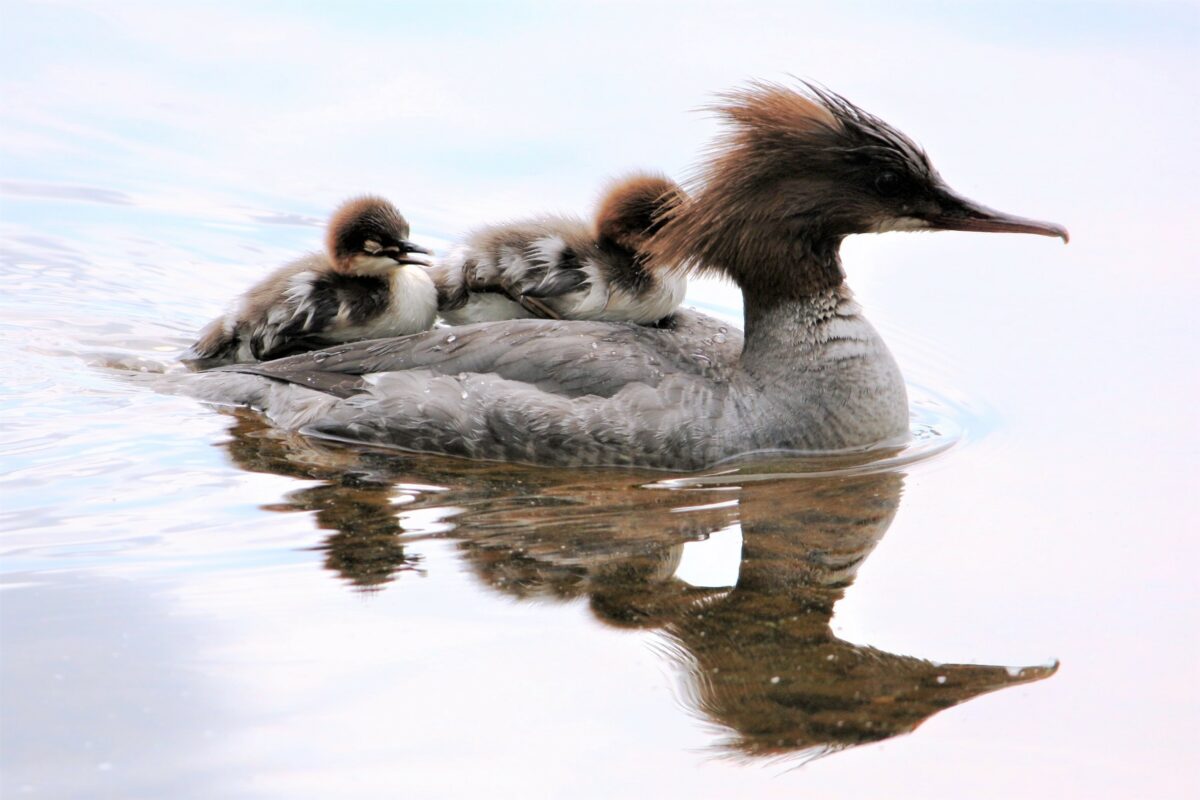 Emon kyydissä on paras olla. Tukkakoskeloperhe ruokaa etsimässä.