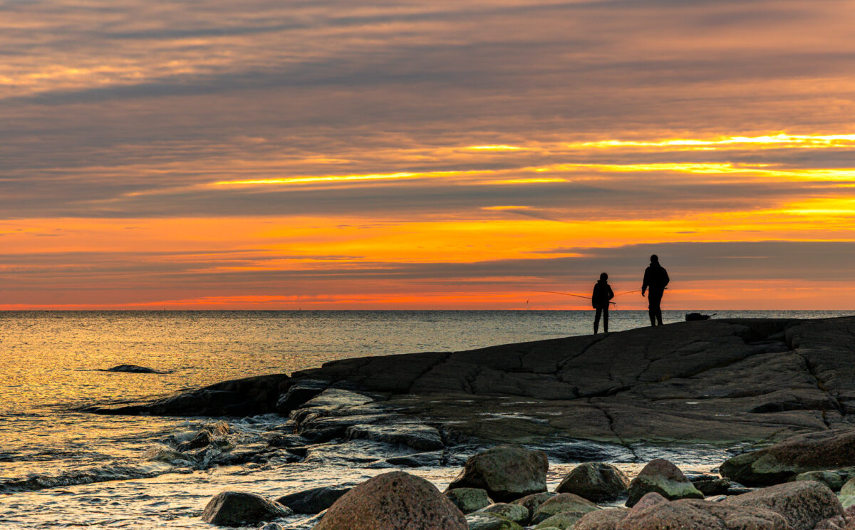 Kaksi kalastajaa syysiltana Varlaxuddenin virkistysalueella Porvoon Emäsalossa.