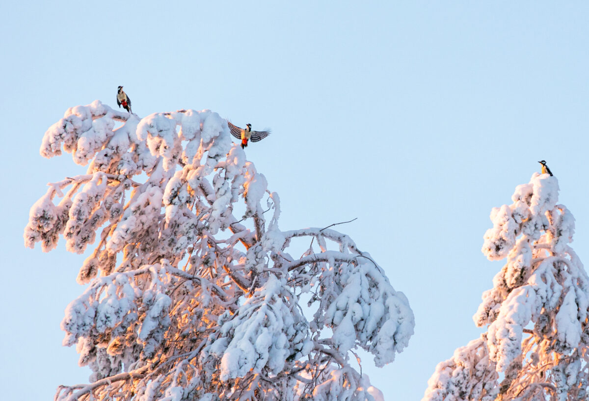 Talvisena pakkaspäivänä kolme käpytikkaa kokoontuivat tykkulumisten mäntyjen oksille nauttimaan auringonsäteistä, jotka hetken aikaa viivähtivät samoilla männynoksilla vuoden ensimmäisen päivän kunniaksi.