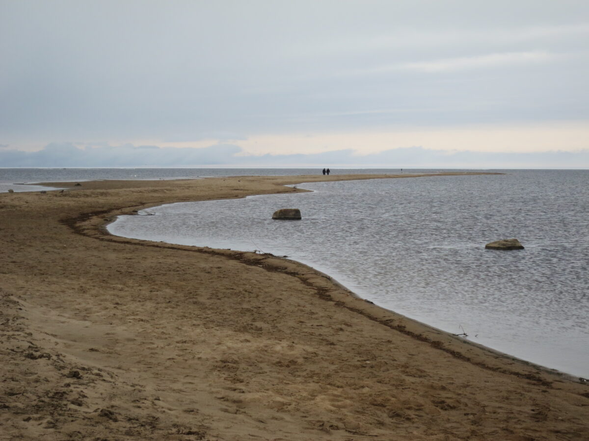 Kuvassa kaksi kulkijaa katselee aavalle merelle keväisellä Kalajoella.