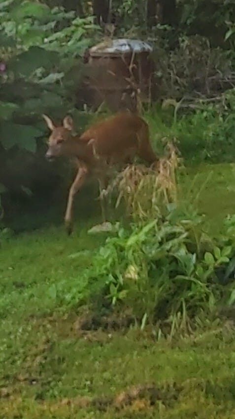 Etäisyys tuvan seinään on n. 8 m. Huonolla kameralla hätäisesti otettu kuva. Kuva on kahden vuoden takaa kesällä. Samassa paikassa sain viime talvena myös kuviin ketun ja mäyrän. Ja tietty erilaisia lintuja. Mm. Varpushaukka oli vähän lähempänä oksan nokassa tinttijahdissa.