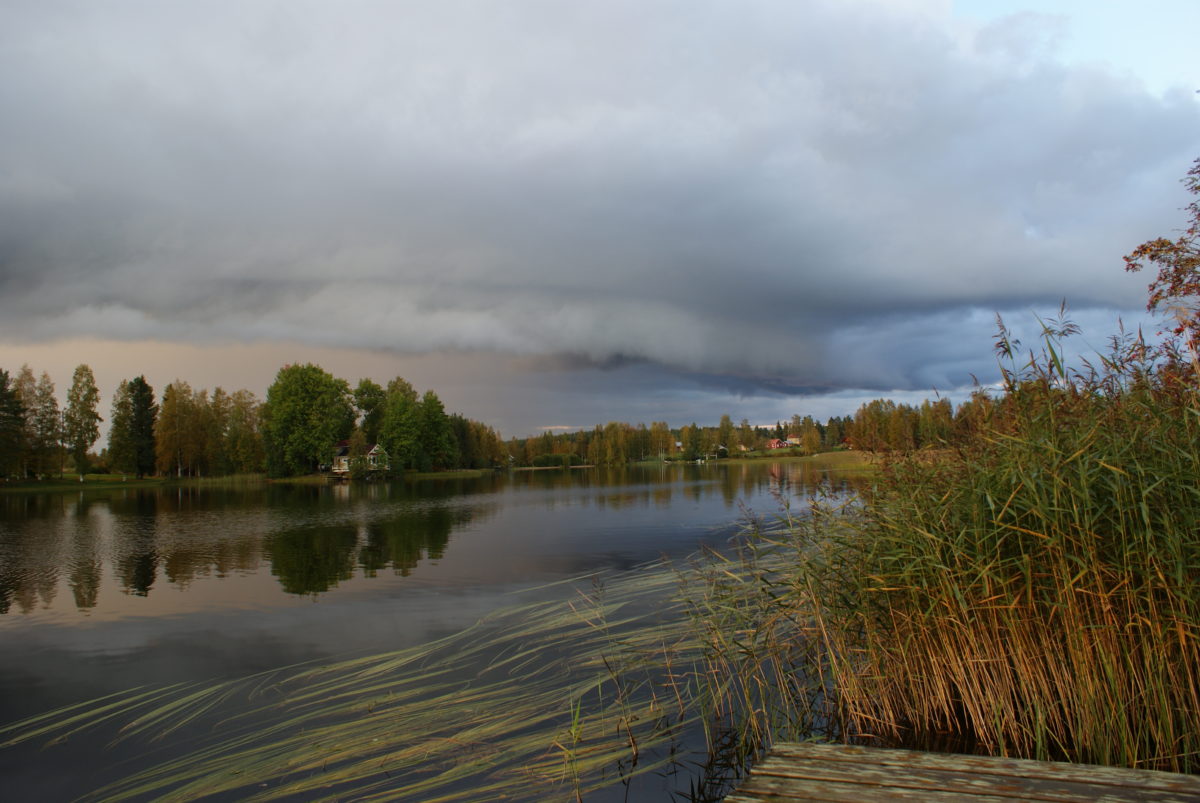 Kuva on otettu syyskuussa v.2010 Alavuden Sapsalammella omassa mökkirannassa. Tummana matalalla vyöryneet pilvet sekä taivaan muuttuminen kelmeän kelllertäväksi ennen ukonilmaa loivat mahtavan värimaailman.