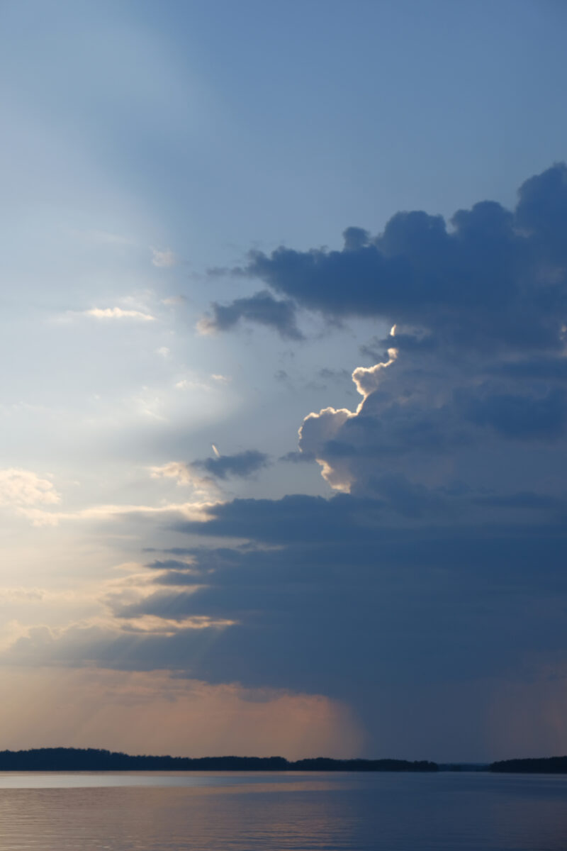Heinäkuun illalla olimme palaamassa takaisin Piirlahteen vierailulta Svartholman linnoitukseen, joka on Loviisan edustalla. Kuva on otettu Gäddragfjärdenillä. Matkalla oli lähes tyyntä ja lämmin kesäilta. Kauempana ukkospilvet ja laskeva aurinko loivat upean värinäytelmän.