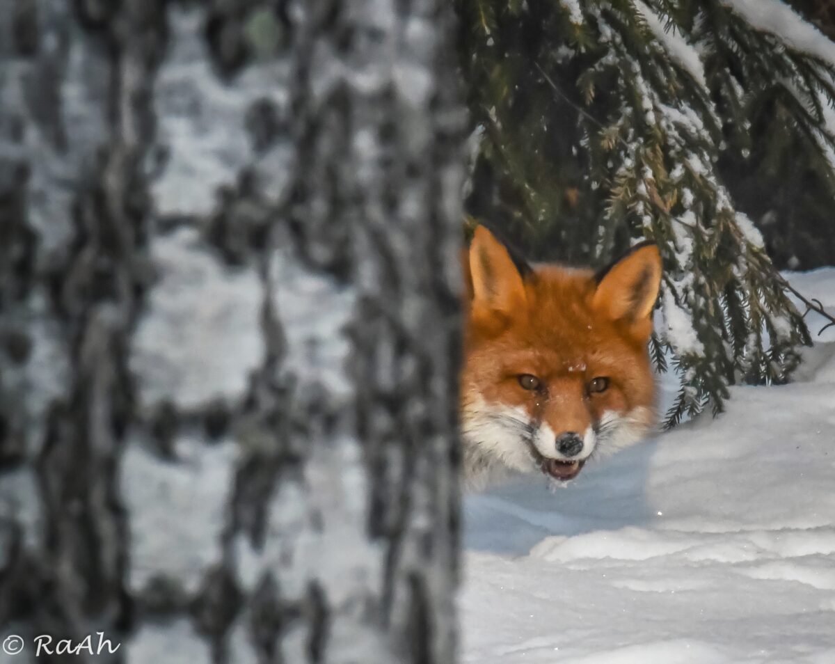 Olin kuvaamassa lintuja piharuokinnalla omalla takapihalla kun kettu kurkisti koivuntakaa, että mitäs täällä on tekeillä