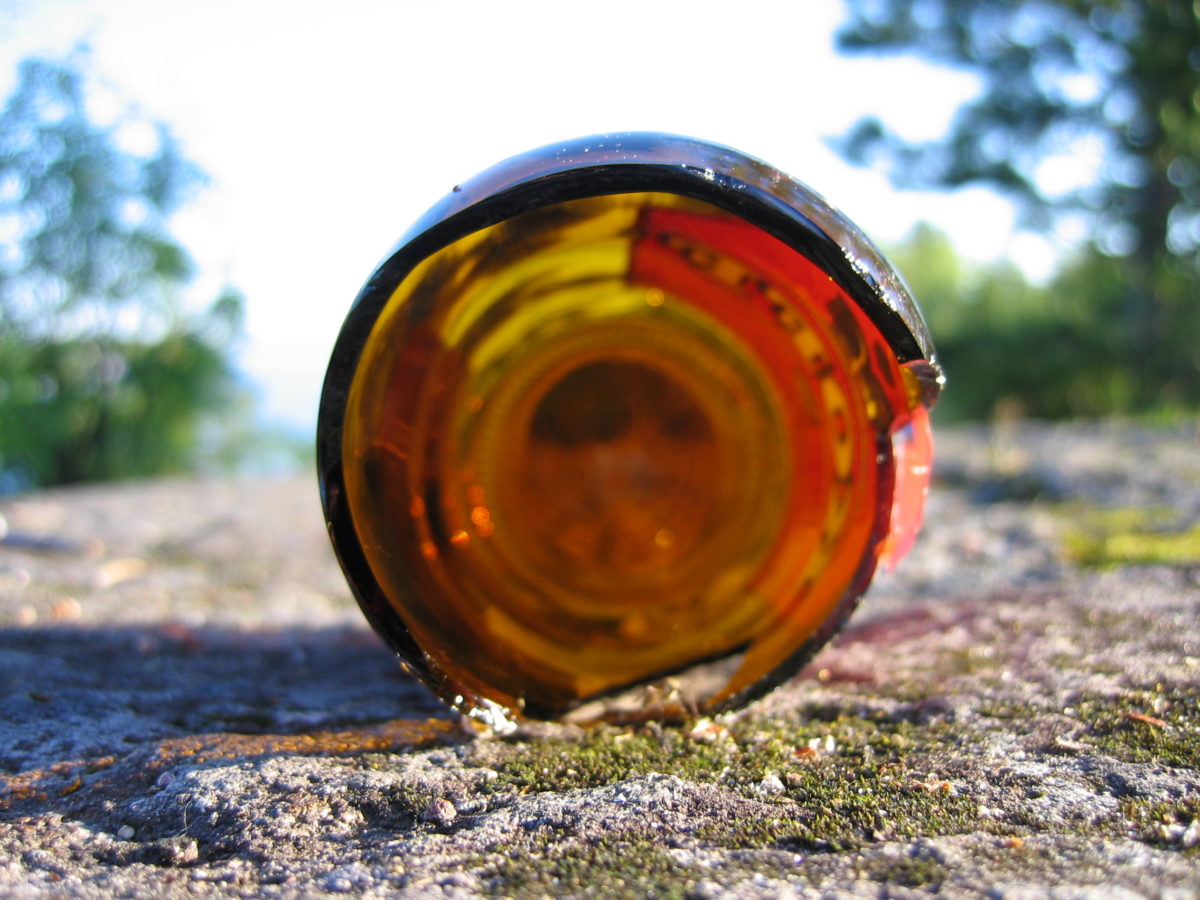 Rikkinäinen kaljapullo kalliolla - ihmisen pohjaton piittaamattomuus.