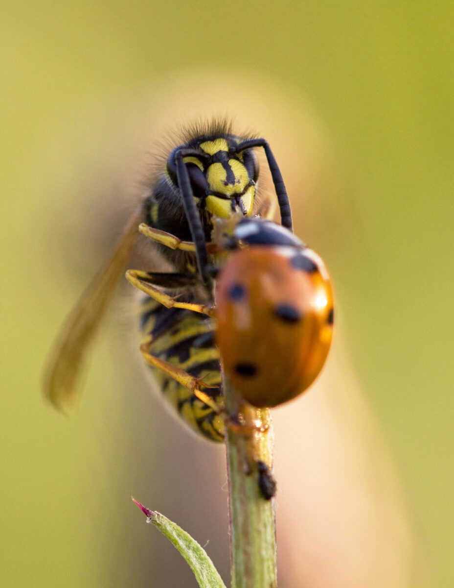 Ampiainen ja seitsenpistepirkko samassa kasvissa vastakkain. Rauhallista yhdessäoloa.