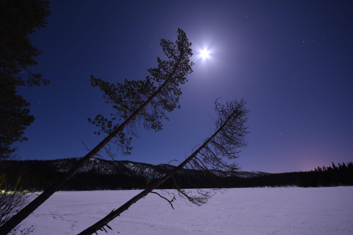 Tammikuinen kipakka pakkasyö Kuusamossa. Kuu valaisee maisemaa, taustalla Valtavaara.