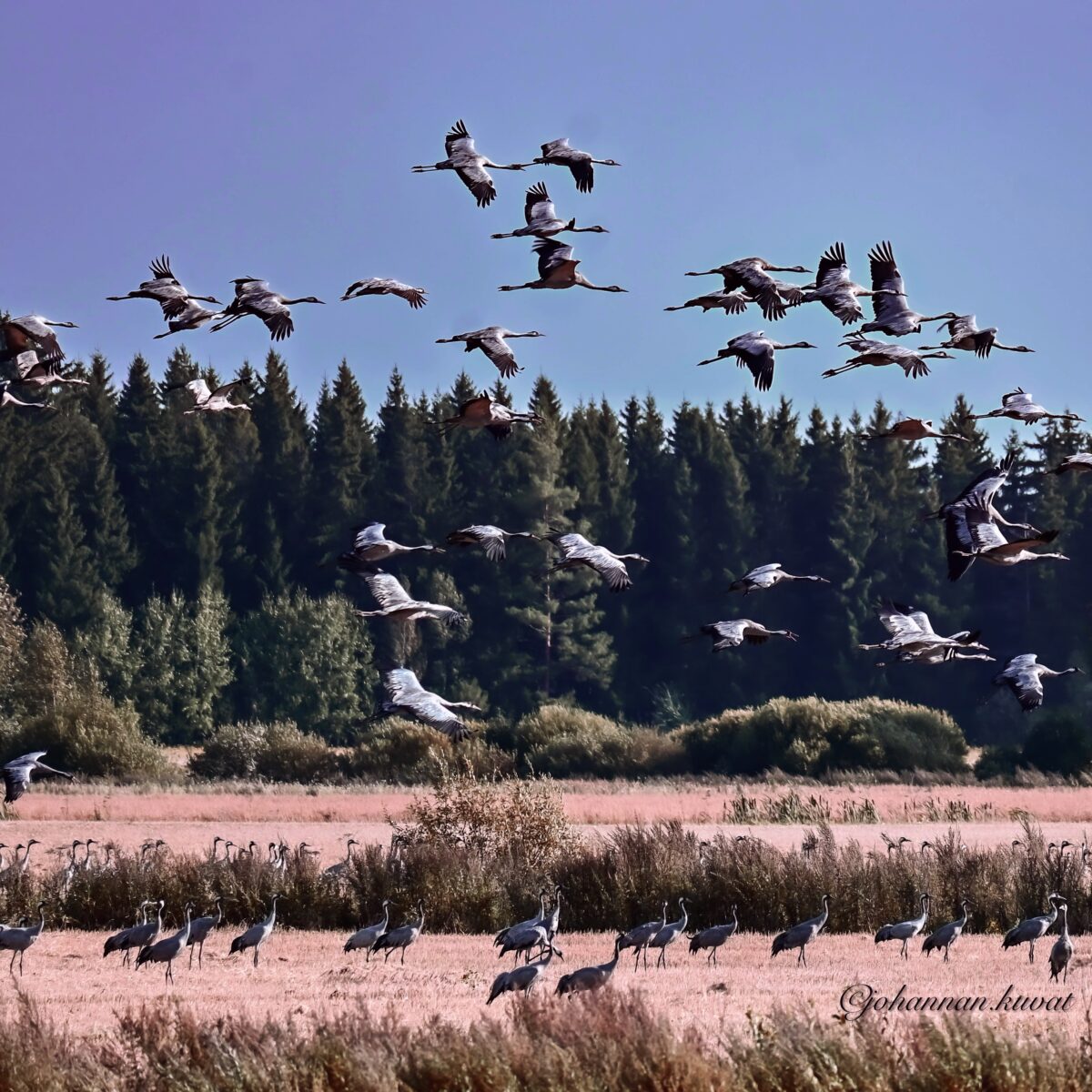 Sadoittain kurkia kokoontuneena pellolla tankkaamaan ennen pitkää lentoa lämpimään.