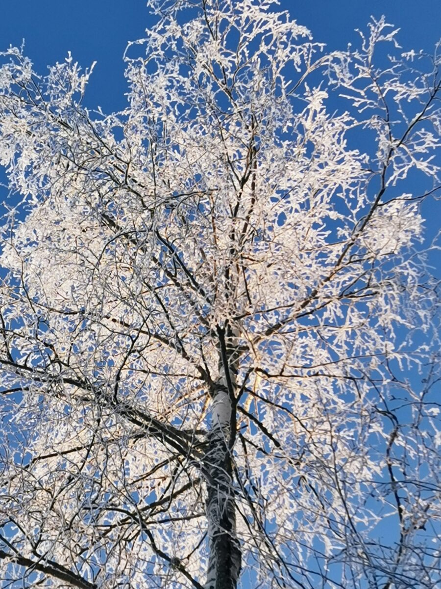 Tammikuun kovassa pakkasilmalla, puut kauniissa kuurassa.