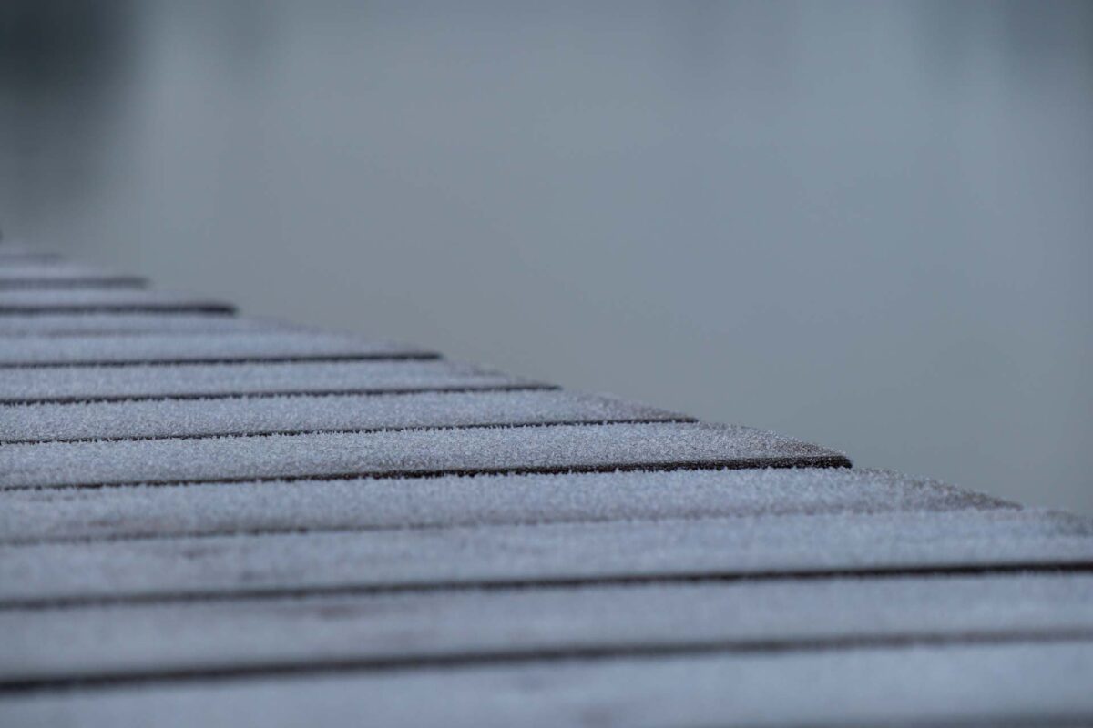 Joulukuun ensimmäiset kuurat mökkilaiturin laudoilla, Merimaskussa