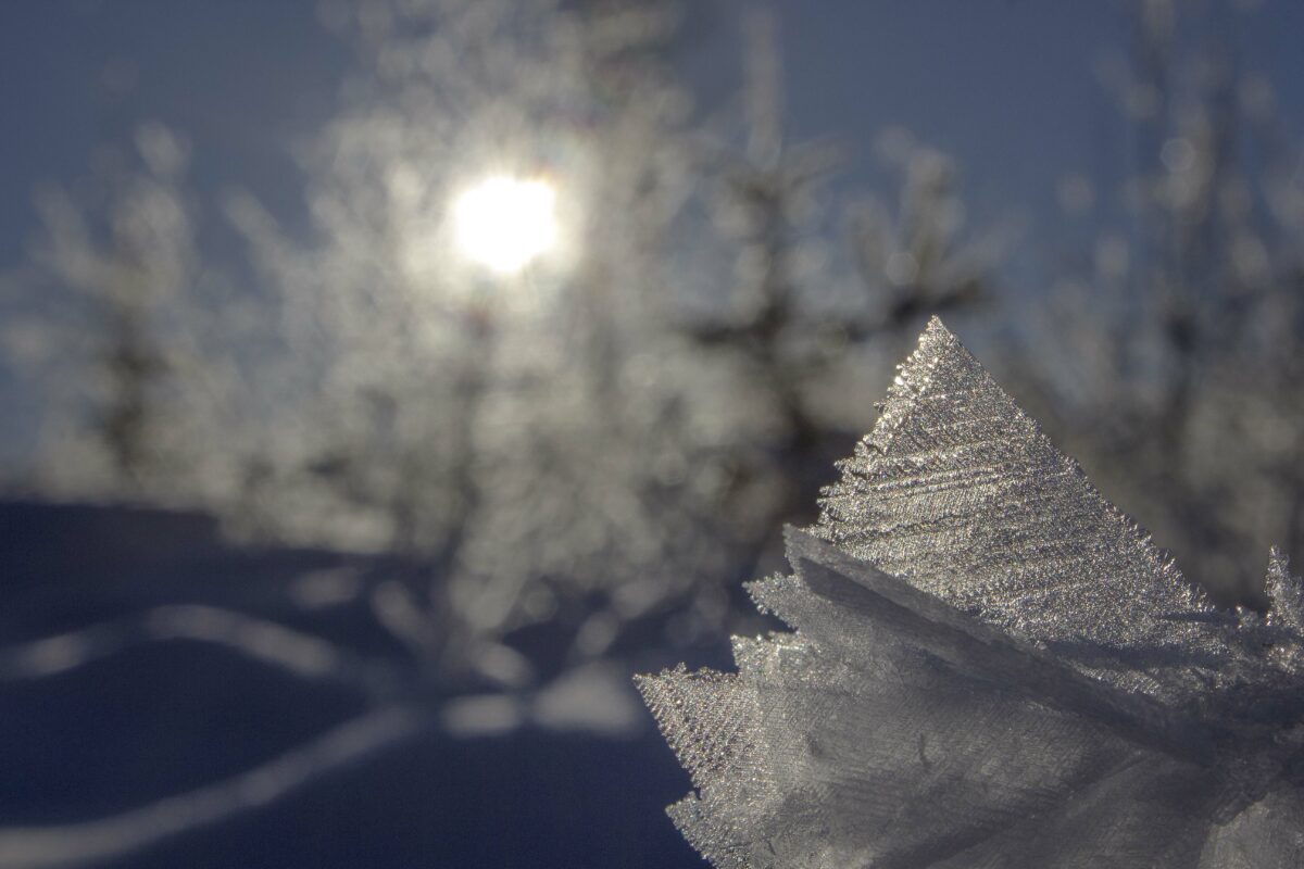 Kun edellisyön kosteus tarttuu oksiin ja lumen pintaan, syntyy taidetta,siipiä, kukkia luontoon.
