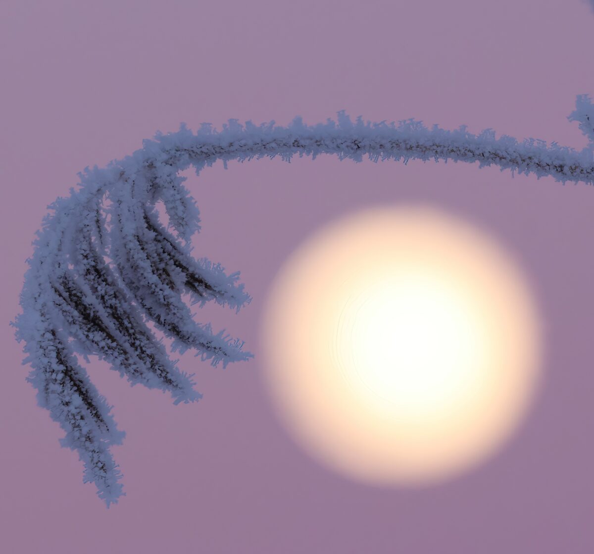 Huurteinen järviruoko ja täysikuu. Pakkasta oli yli 20 astetta, mutta kamera toimi. Laskevan auringon viime säteet loivat valoa jäätyneeseen ruokoon, ja täysikuu nousi horisontin ylle vastakkaisella puolella.
