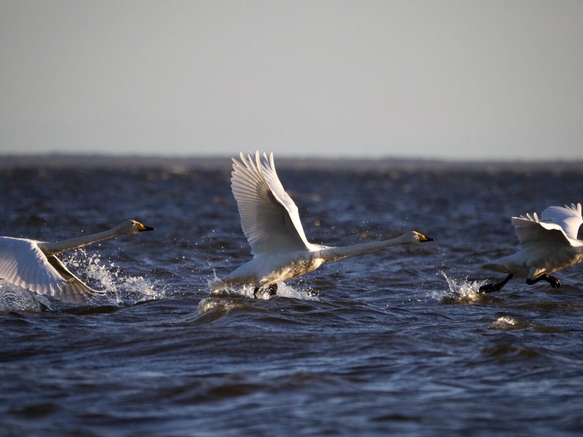 Laulujoutsenia lähdössä lentoon Hailuodon edustalla eräänä syyskuun viikonloppuna.