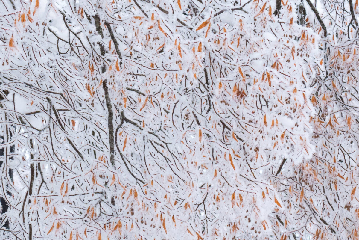 Ensilumi muodossti \"lumiharson\" puun ympärille ja syksyn lehdet pilkistävät esiin harson läpi.