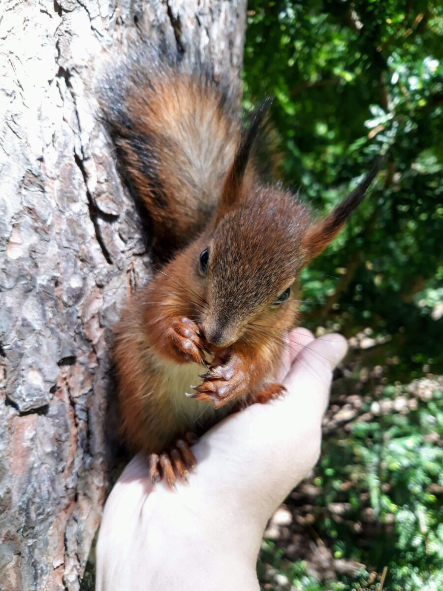 Ensimmäinen kerta kun orava tuli kädelleni istahtamaan ja nauttimaan pähkinöistä.