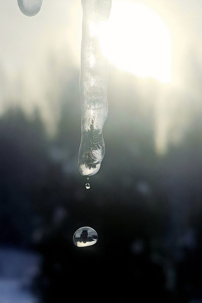 Se ääni kun vesi tippuu pisarasta.. maisema näkyy himmeästi pisarassa ja jääpuikossa. Hieno hetki!