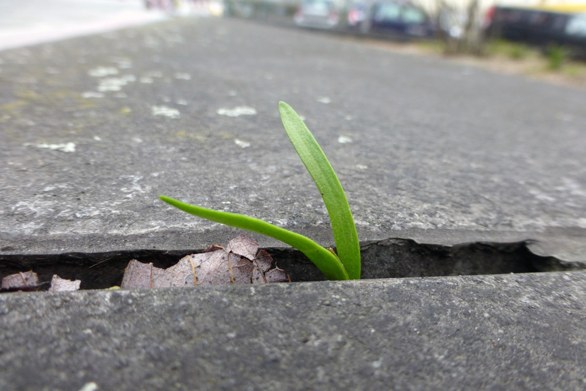 Hellyttävä näky keväällä. Paljon vastakohtia: pehmeä/kova, väri/harmaus, pieni/suuri. Ihminen ei voi kahlita luontoa.