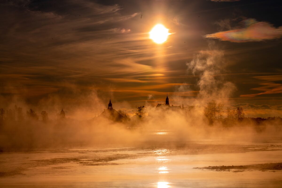 Tammikuussa meri on vielä auki Helsingin Eteläsatamassa. Pakkasta lähes -20°C. Meri palaa. (merisavu on haihtumissumua. Ilman lämpötilan ollessa vähintään -15 asteinen, kylmä ilma virtaa juuri ja juuri sulan meren yläpuolelle.) Oikealla yläkulmassa helmiäispilvi.