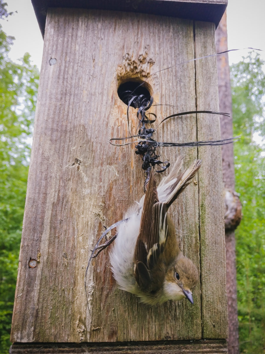 Viime kesänä pihapiirin linnunpöntöstä roikkui kirjosiepon poikanen. Muut poikaset olivat jo lähteneet pesästä, mutta tämä oli jäänyt jalastaan kiinni muovisuikaleisiin, joita löytyy ainakin mansikkamaan katemateriaaleista. Poikanen saatiin irrotettua ja se oli myöhemmin lähtenyt pöntöstä omin avuin.
