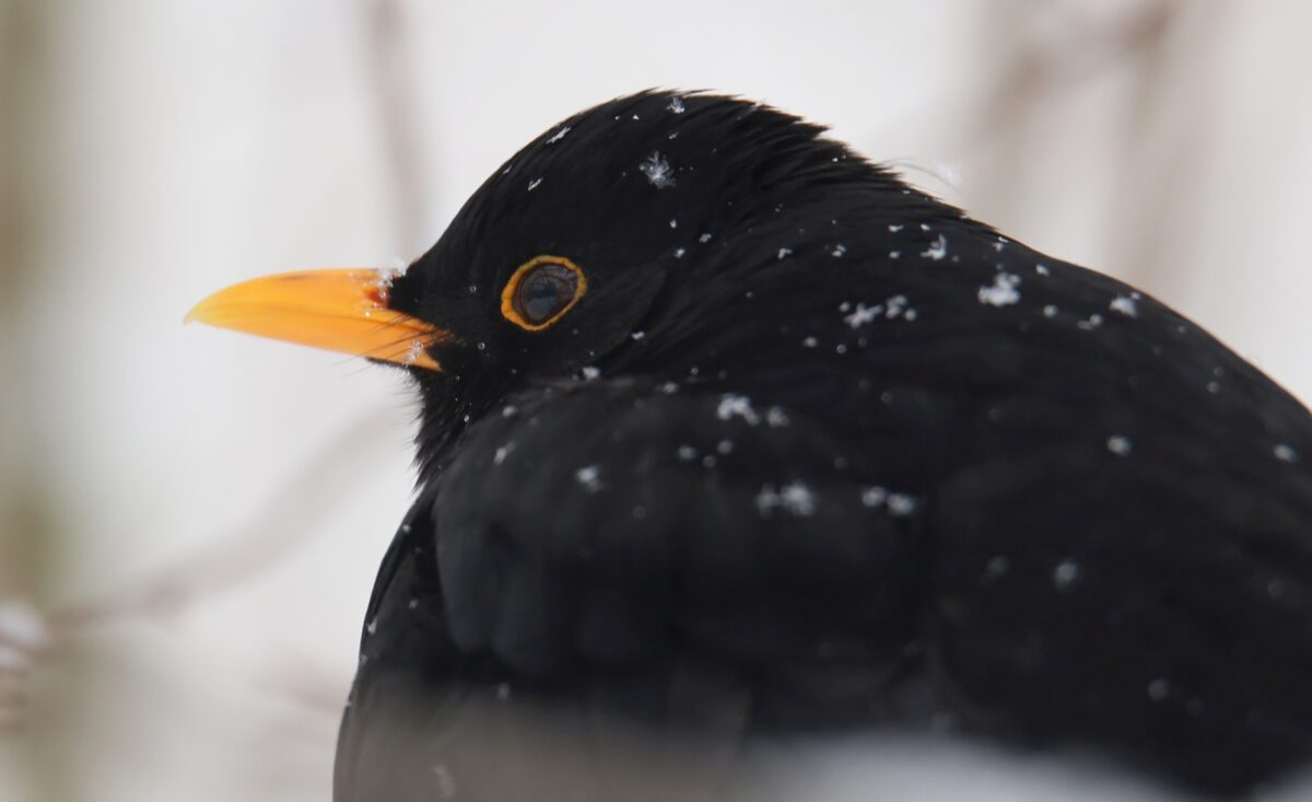 Mustarastas lennähti piiloon pensaaseen ja minä haukkana perässä. Se laski aika lähelle kuvaaamaan: ehkä luotti pensaan suojaan. Lunta satoi valtoimeneen ja mustarastaskin sai siitä osansa.