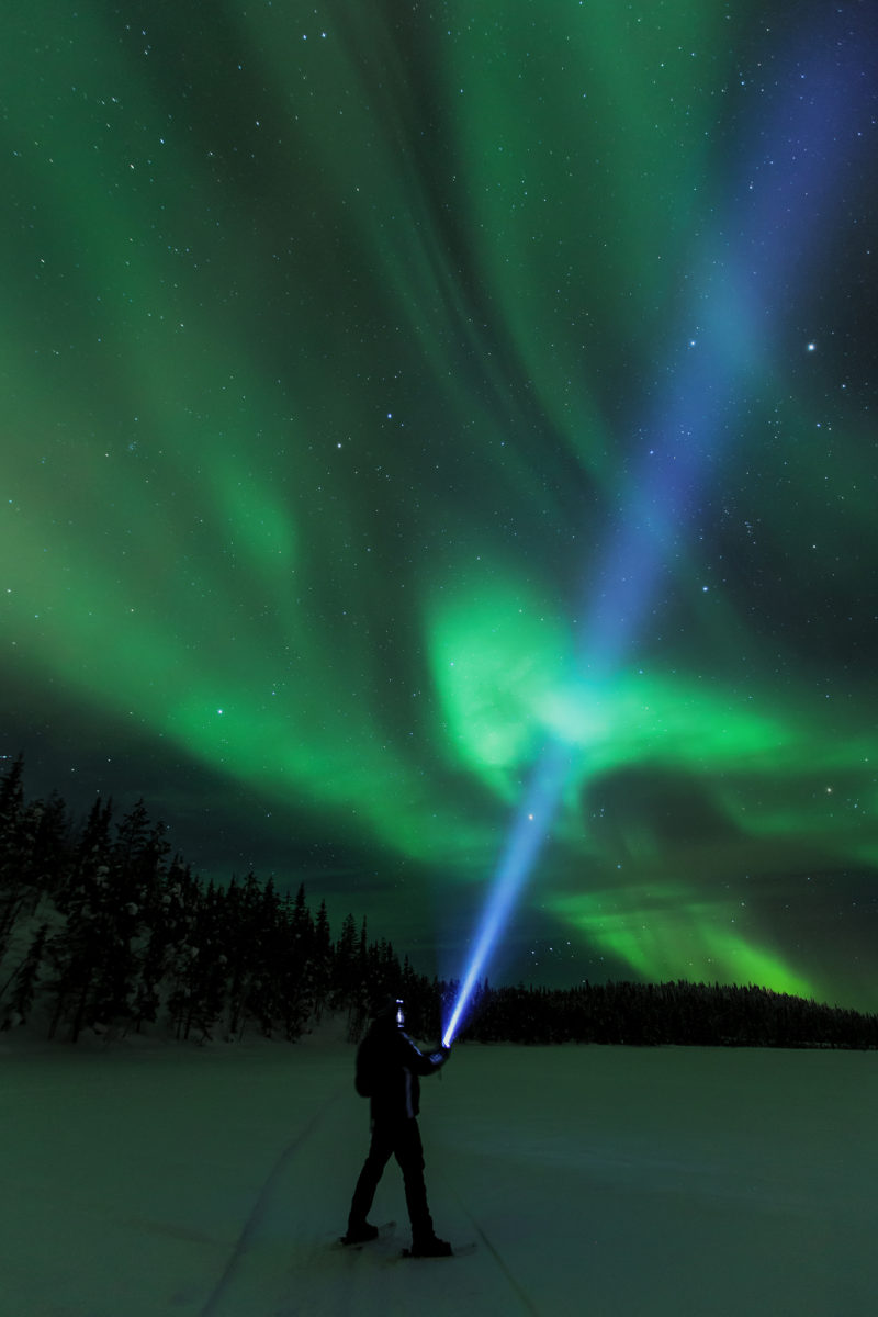 Lumikenkäilemässä huikeassa revontuliyössä Kuusamossa. Ei juuri lamppua olisi tarvinnut taivaan loistaessa joka suunnalla.