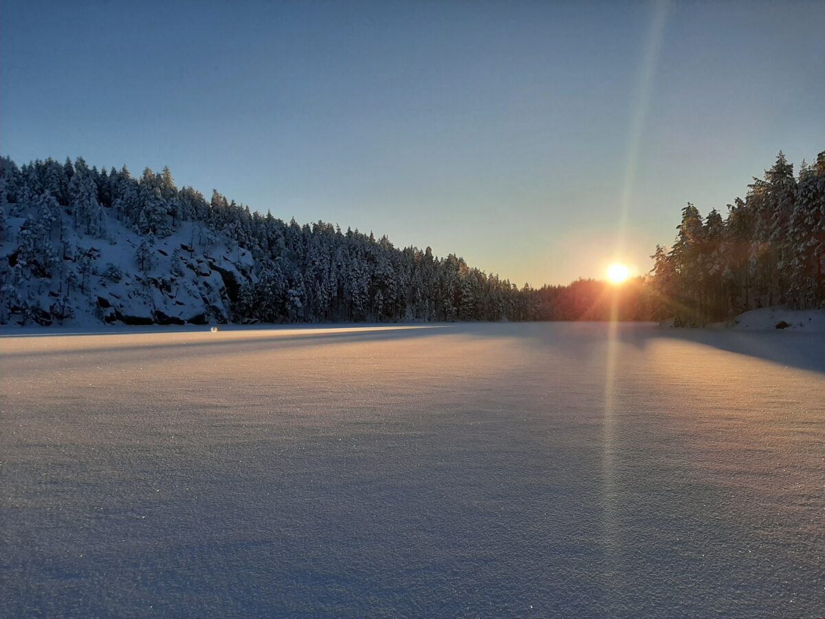 Olin kolaamassa norpille pesiä Juvalla 7.1. ja sää oli todella kylmä, mutta upea. Kuvaan tallentui upea nouseva aurinko Juvan Sarkastenlammella. Tässä tilanteessa olimme matkalla varsinaiselle pesäkolauspaikalle.
