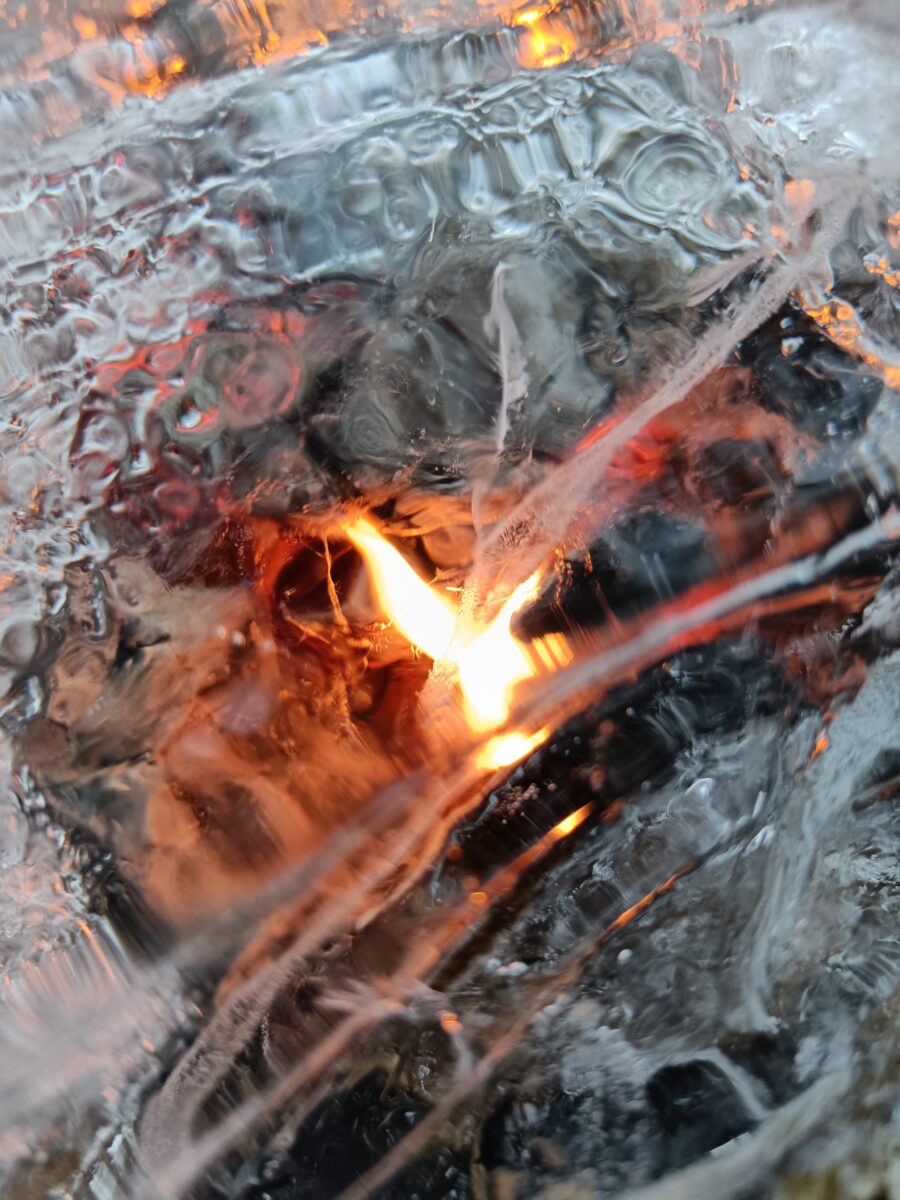 Olimme lasteni (6&8v) kanssa metsäretkellä. Teimme nuotiopaikalle tulet, jossa sitten lämmitimme eväitämme. Nuotiopaikka on pienen lammen rannalla, jonka jäällä kävimme sitten tutkimusretkellä. Sieltä nuorempi poikani toi mukanaan nuotiopaikalle jääpalan, jonka halusi sulattaa nuotion loimussa. Tässä sitten näin upean nuotion kuvajaisen jään läpi ja olihan siitä pakko ottaa kuva 🙂