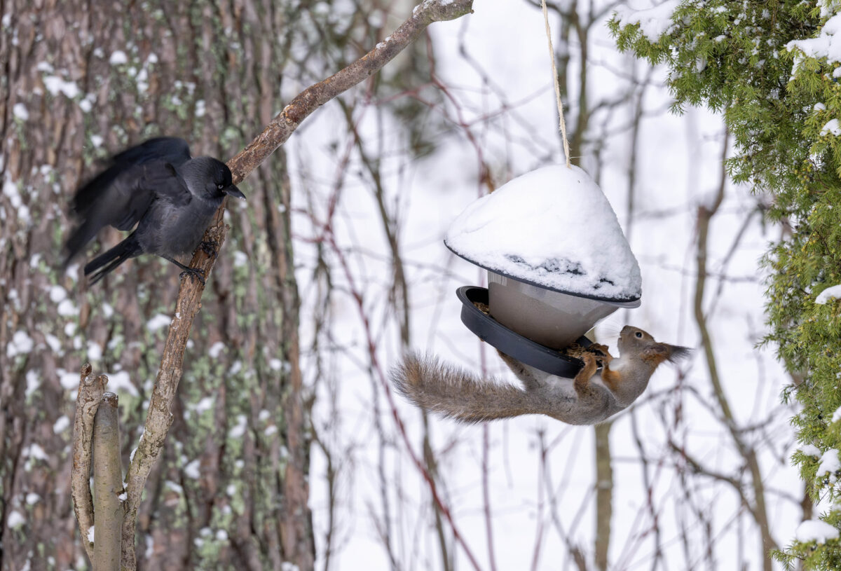 Oravalla ja naakka yrittävät syödä pikkulintujen ruokinnalla. Molemmilla on vaikeuksia.