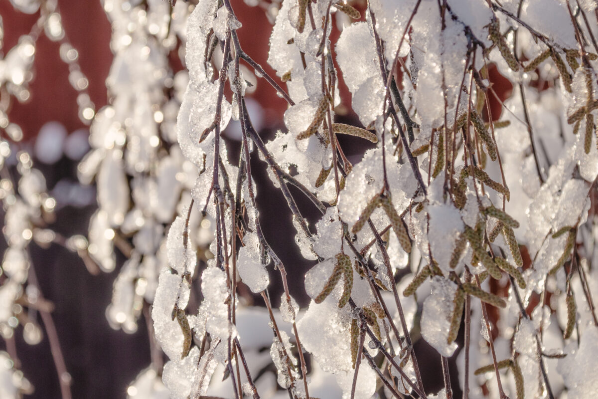 Jään kuorruttamat koivunoksat kimaltelevat auringonpaisteessa