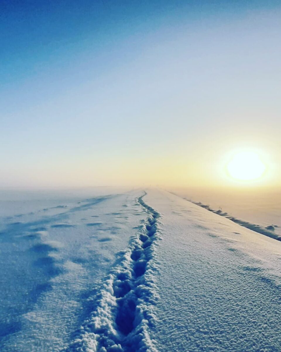 Kuva on otettu Söderfjärdenin meteoriittipellolla aurinkoisena pakkaspäivänä joulun 2021 jälkeisinä välipäivinä. Joulunahan saimme Vaasan seudulle yli puoli metriä lunta. Voi kun talvi täällä olisikin aina näin luminen. Lapsuuden talvet muistan juuri tälllaisina. Koskematon hanki, jonne minä ja ne monet isot tai pienemmätkin eläinystävät luomme omat polkumme ja jälkemme.