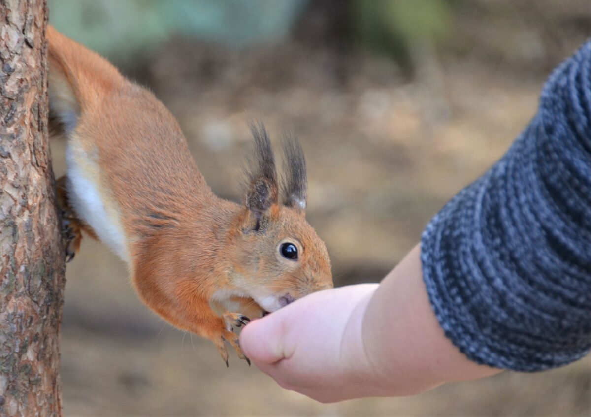 Oravat ovat melkein jokapäiväisiä kavereita kotona takapihalla ja mökillä lähiympäristössä. Tämä orava on kaupunkilainen ja huomattavasti maalaisserkkujaan rohkeampi. Se tuli Tampereella eväsretkellämme pyytämään välipalaa ja rohkeni tulla hakemaan sitä kädestä.