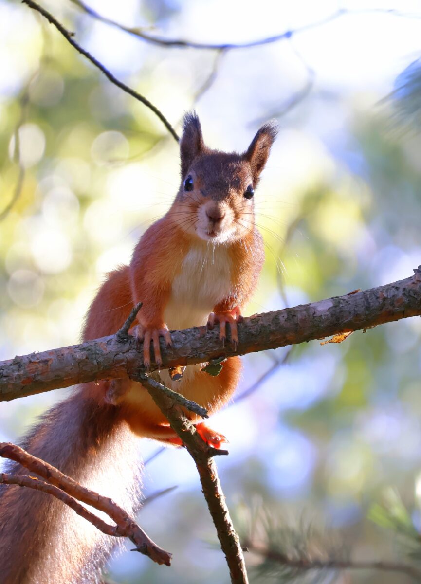 Kohtasin tämän onnellisen oravan sattumalta lintuja bongatessa, männyn oksalla istumassa. Oli niin hyvällä tuulella, että antoi kuvankin ottaa. Seurasaari, Helsinki.