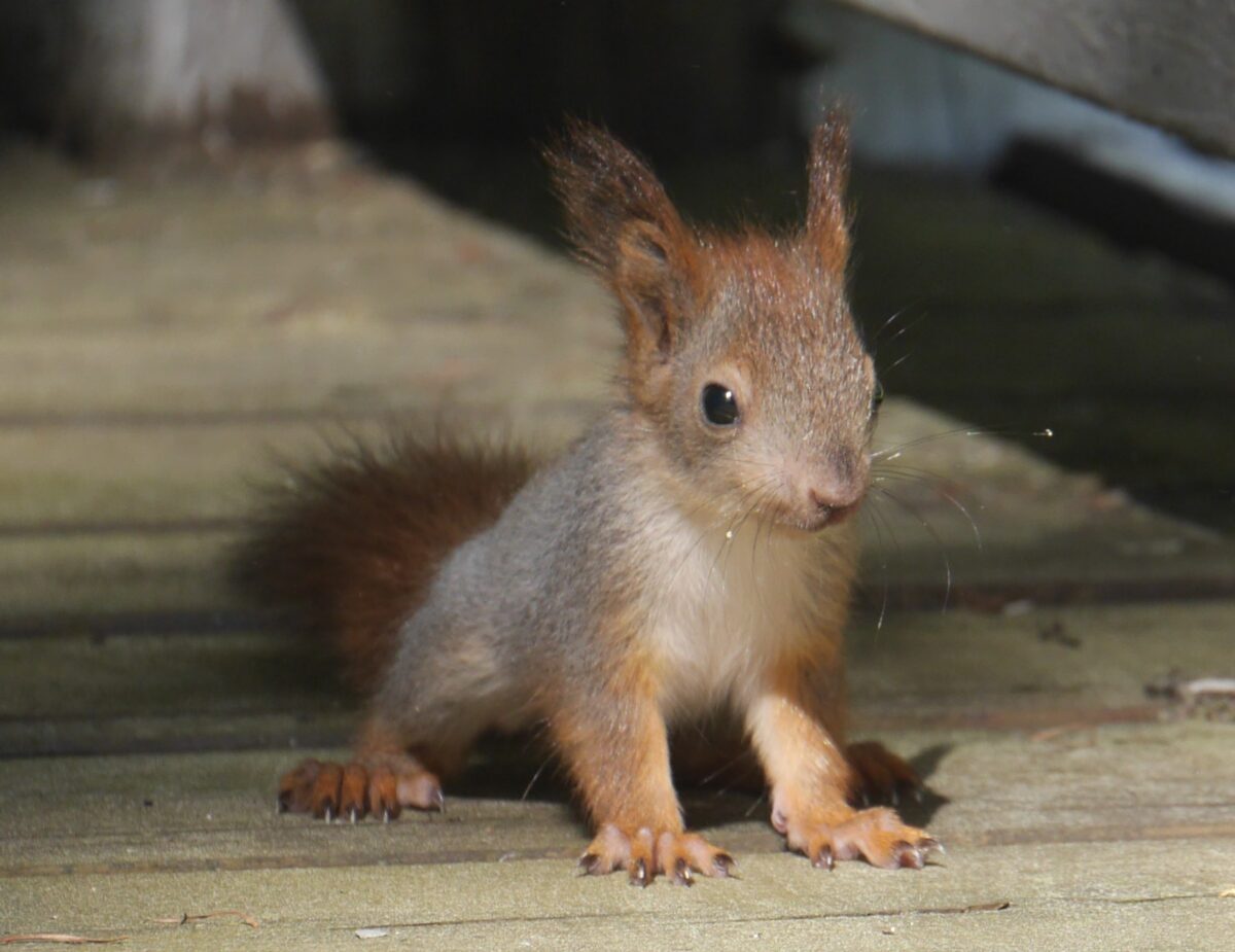 Kerran terassilla löhöessäni huomasin 5 silmäparin tuijottavan katonrajan tukiparrun päältä. Siellä minua tuijotti oravaemo ja neljä poikasta. Hiippailin heti hakemaan kameraani. Palattuani yksi poikasista olikin alhaalla emonsa kanssa. Poikanen yritti selvästi päästä imemään, mutta emo torjui sen. Minun läsnäoloni metrin päässä ei häirinnyt niitä lainkaan. Lopulta emo kiipesi ylös ja koetti säksättäen houkutella poikasta luokseen. Kun poikanen ei mennyt, emo otti se suuhunsa ja vei ylös.