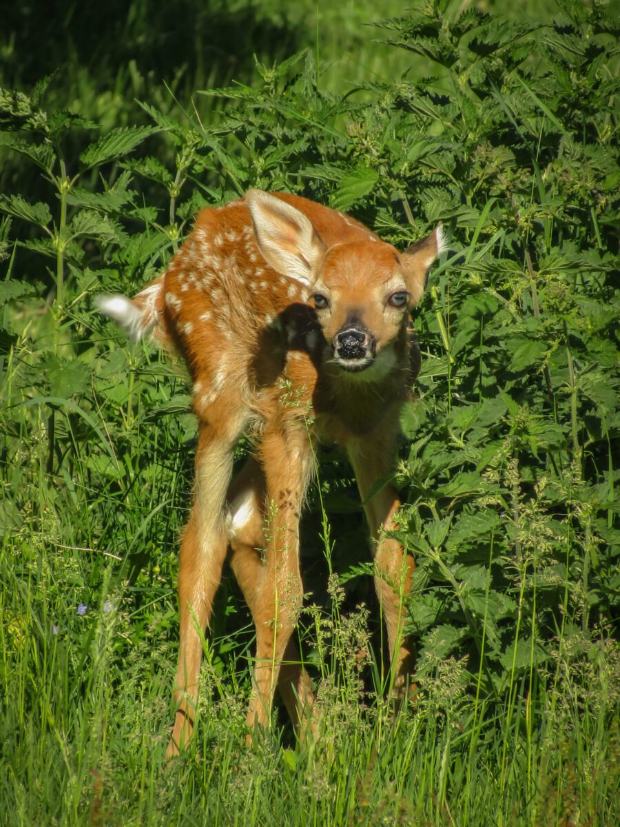 Aurinkoisena kesäpäivänä peuranvasa ottaa päivän ensimmäiset askeleet.