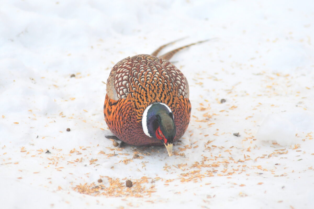 6.1.2024 pakkanen paukkuu. Piti laittaa fasaaneille kauraa hangelle että pärjäävät.