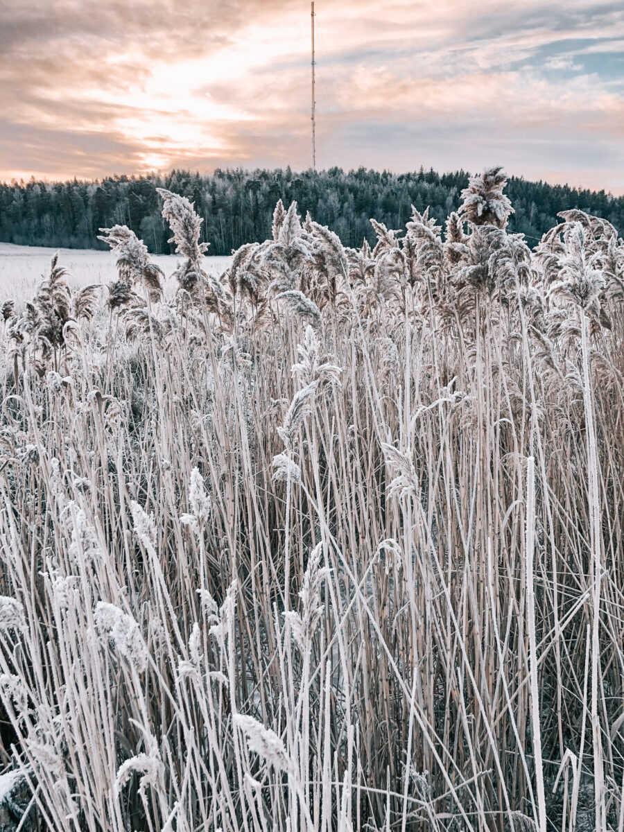 Joulukuun alussa 2021 kuvattu kirpeänä pakkasaamuna luontopolun varrella, -15 astetta.