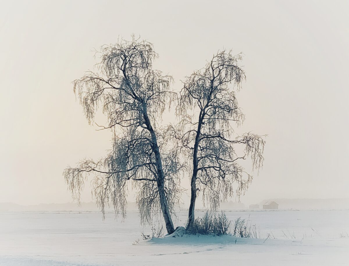 Pakkasta lähes kolmekymmentä astetta, hieman utuinen aamu ja yksinäinen puu.