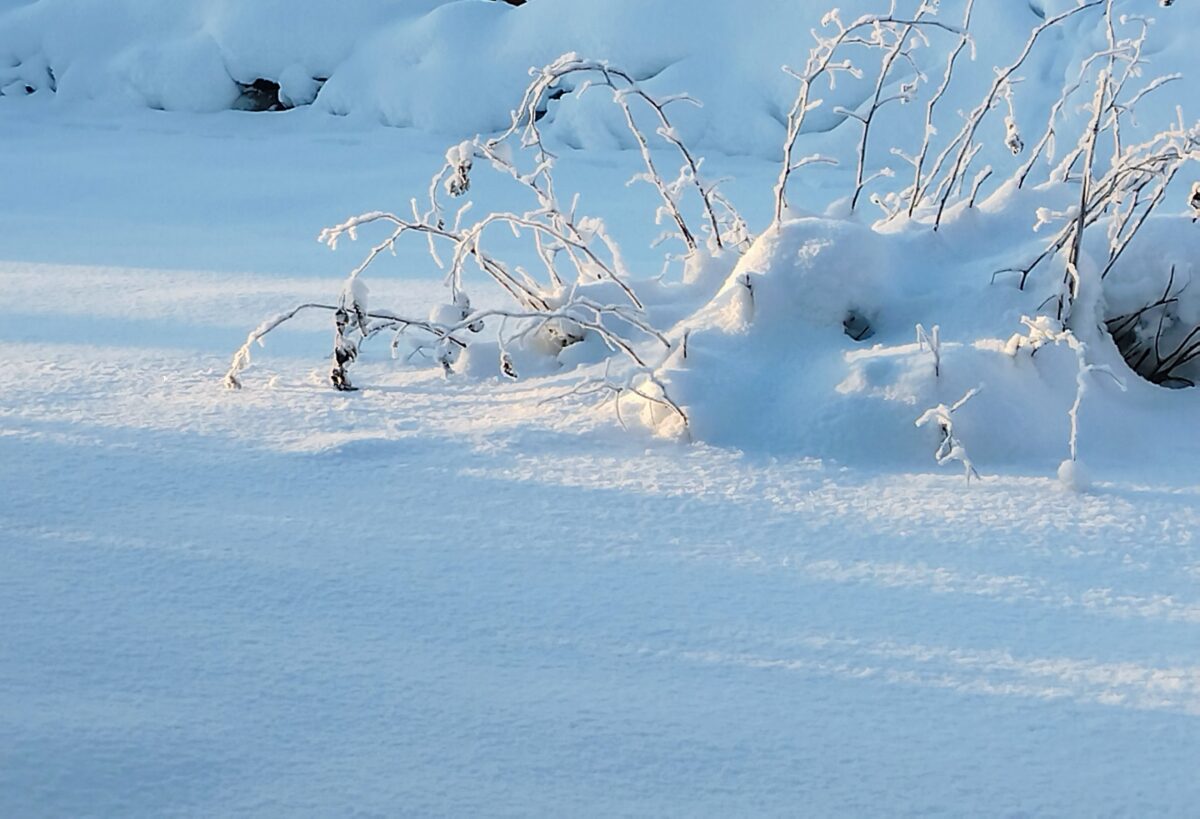 Kaunis pakkashetki auringon säteiden tuodessa esiin lumen kauneuden.