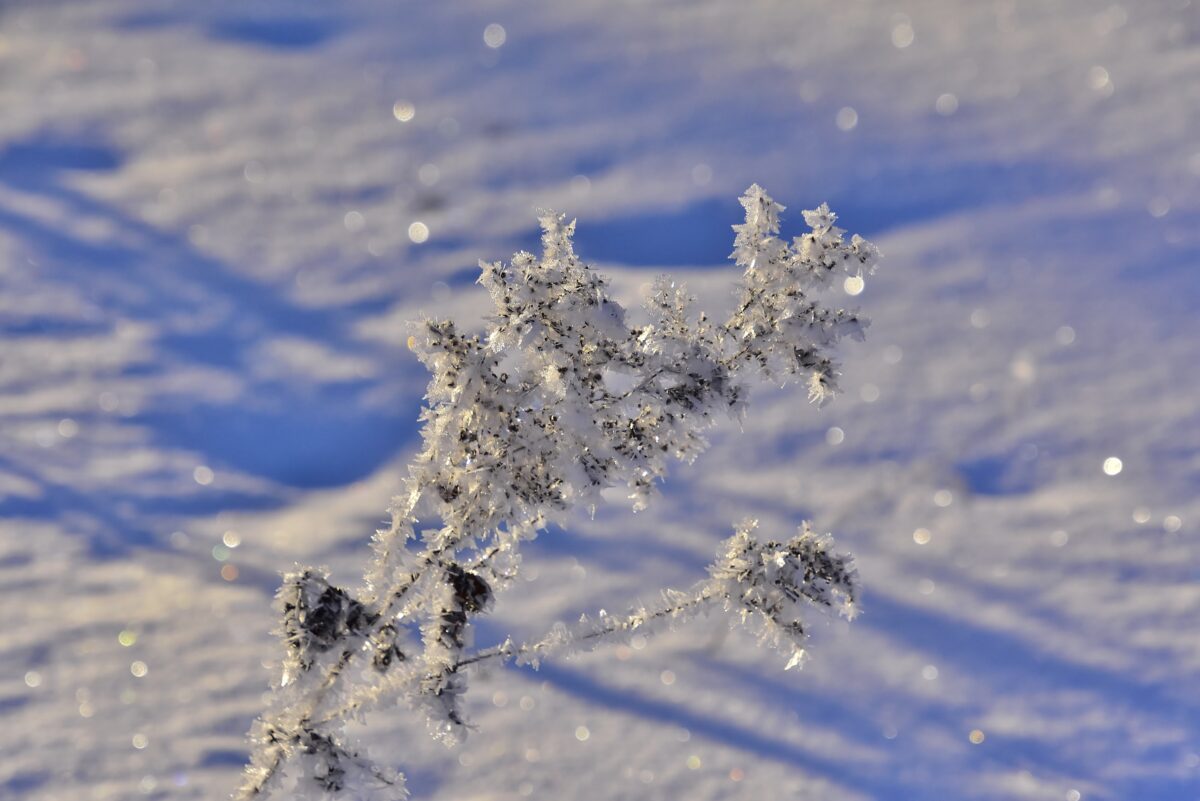 Pakkaspäivän auringonpaisteessa kasvit ja hanki kimaltelevat kauniisti.