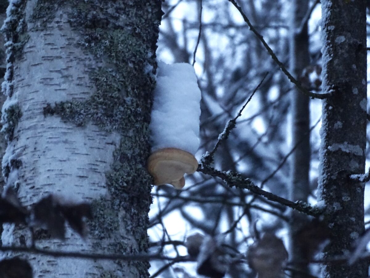 Linturetkellä huomasin koivun kyljessä lumoavan kauniin lumimittarin. Pakkasherra oli asetellut tällaisia \"lumikääpälaitteitaan\" enemmänkin, kun vain huomasi tarkkailla. Kuva on otettu 20.2.2024 Keski-Pohjanmaalla, Kokkolan Rimmissä.