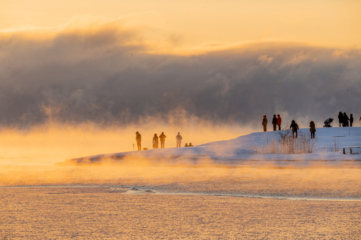 Kuva on otettu tämän vuoden ensimmäisenä päivänä, kun kova pakkaspäivä sai Suomenlahden \"kiehumaan\" ja ihmiset tulivat ihastelemaan näkyä Helsingin Kaivopuiston edustalle Uunisaareen.