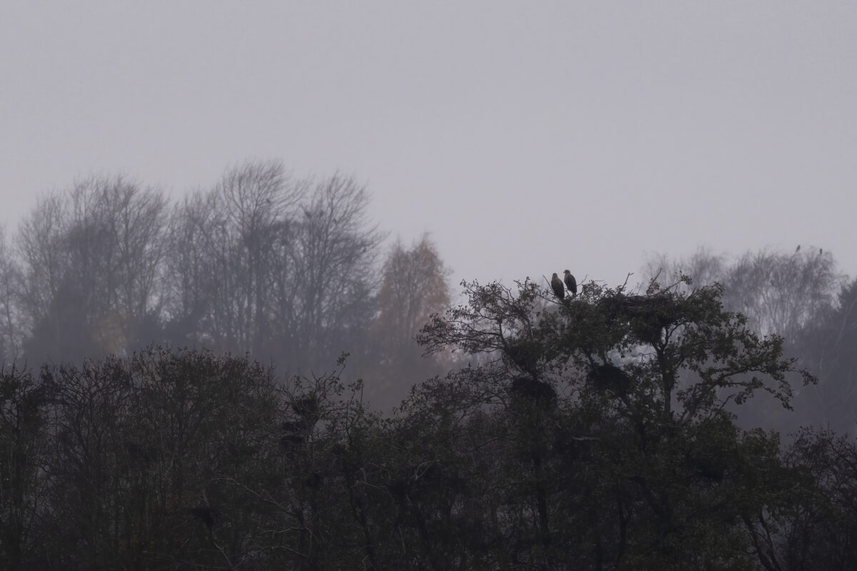Vanhankaupunginlahden merikotka pari pitää toisilleen seuraa harmaana lokakuun päivänä.