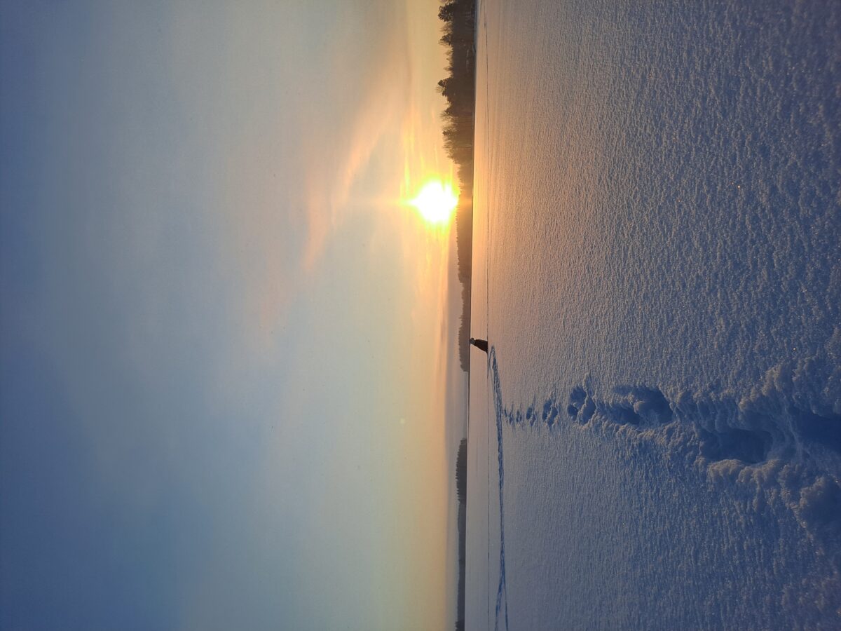 Olin koirien kanssa Tapaninpäivänä Ähtärinjärvellä ja toinen koiristani tarpoi hangessa minua paljon edempänä, kunnes jäi vain istumaan kaikessa rauhassa. Siellä istui keskellä kylmää hankea, paukkupakkasessa talvea katseli.