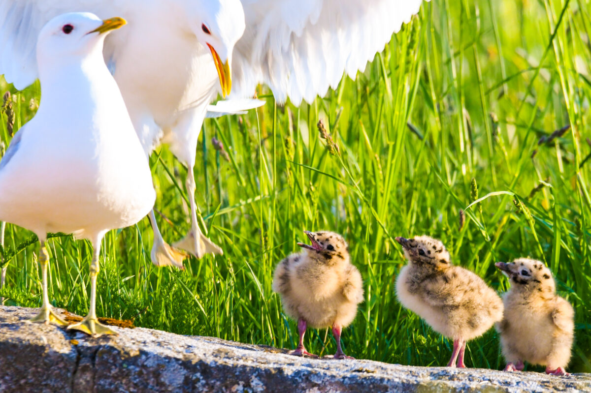 Asun Hämeen linnan lähellä ja yhtenä kesäiltana tuli lähdettyä kameran kanssa linnalle. Linnan vallin päältä löytyi tuore kalalokkiperhe ja poikaset näyttivät nauttivan olostaan lämpimän illan auringossa. Kuva on otettu, kun toinenkin emoista laskeutui vallille ja koko perhe oli jälleen koossa.