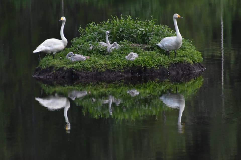 Joutsenperhe oli asettunut viettämään kesäpäivää koko perheen voimin