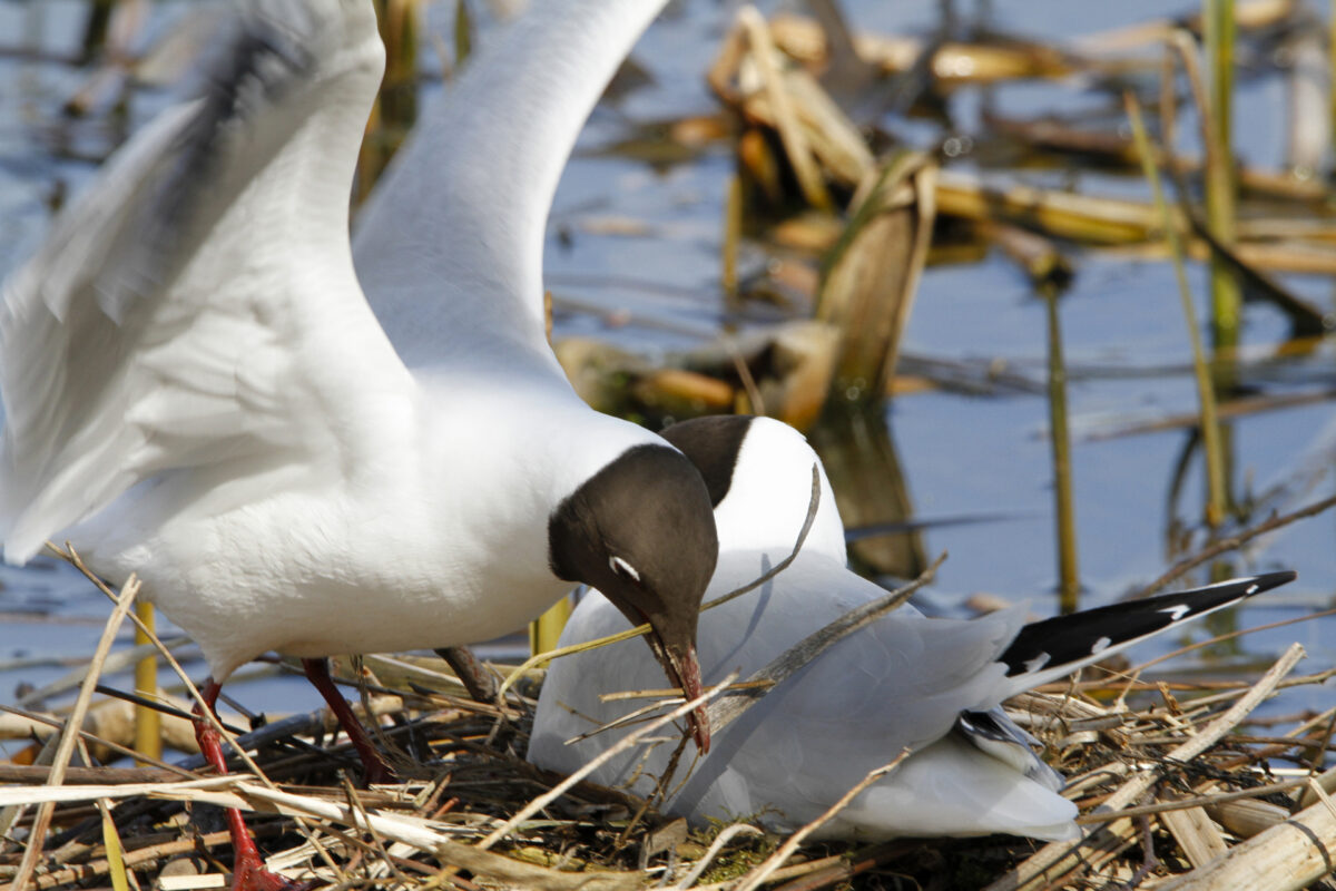 Naurulokki pariskunta rakentaa yhteistä tulevaisuutta, toinen toistaan tukien. Kuva otettu Suomenojan lintualtaalla Espoossa.
