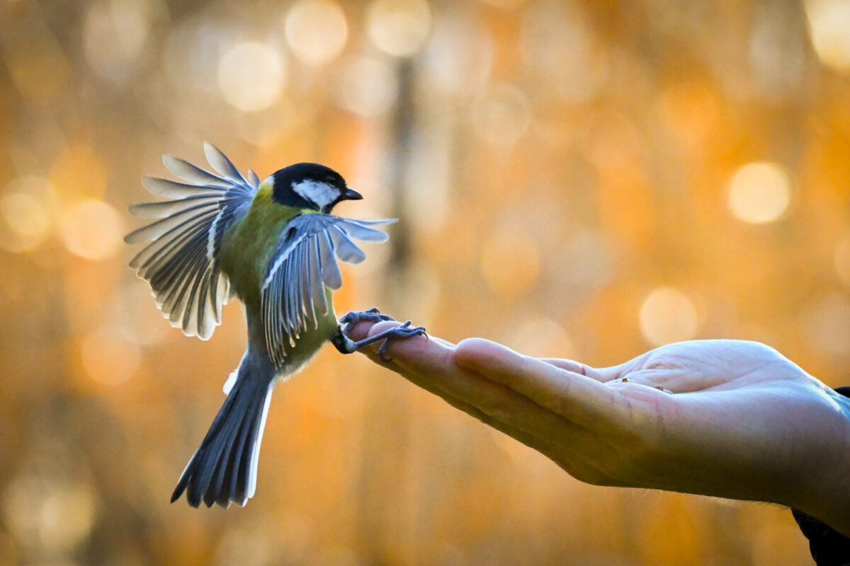 Alunperin tarkoitus oli kuvata pähkinänakkelia Seurasaaressa. Ruokintapaikalla liikkunut nakkeli pysytteli kuitenkin lähinnä varjoisissa paikoissa, joten päätin kokeilla, jos tiaisista saisi lentokuvia paremmassa valaistuksessa. Lopulta onnistunein kuva olikin kuva, jossa talitiainen juuri laskeutuu ruokaa tarjoavalle kädelle.