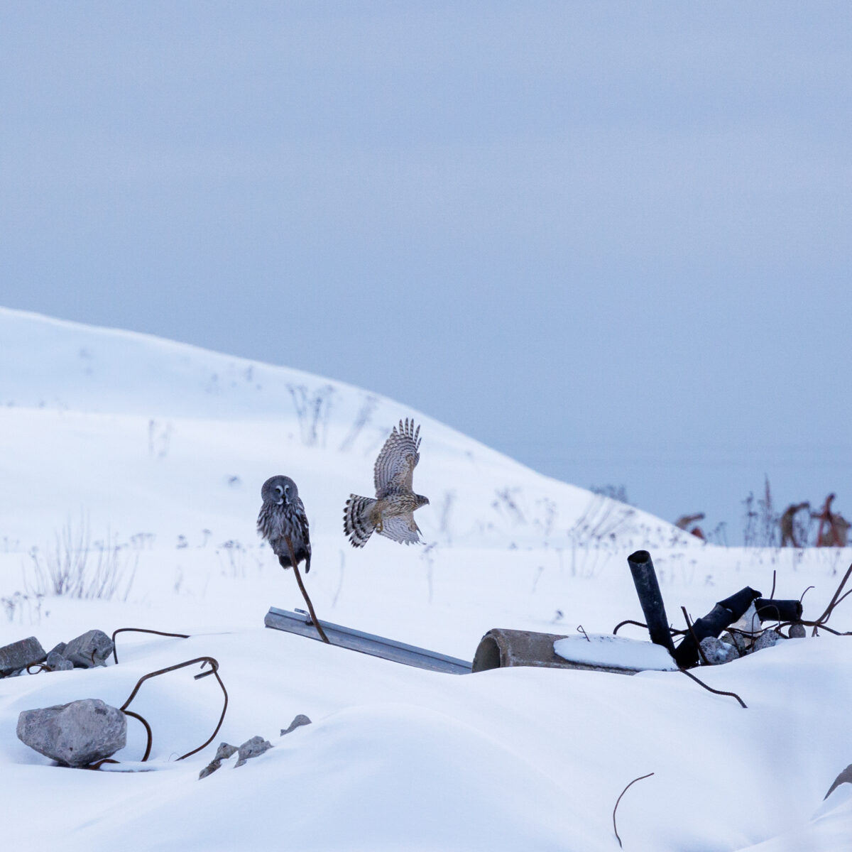 Samassa nuori kanahaukka tekikin syöksyn ja yritti saada lapinpöllöä nousemaan paikaltaan. Varmaankin haukka olisi halunnut kilpailijan pois omakseen luulemaltaan ruokapaikaltaan.
