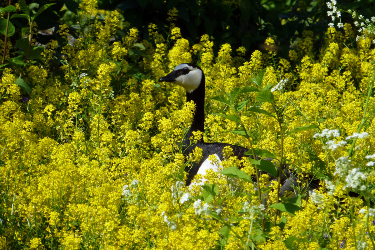 Saari Helsingin edustalla, alkukesän kukkaloisto, valkoposkihanhet pesivät